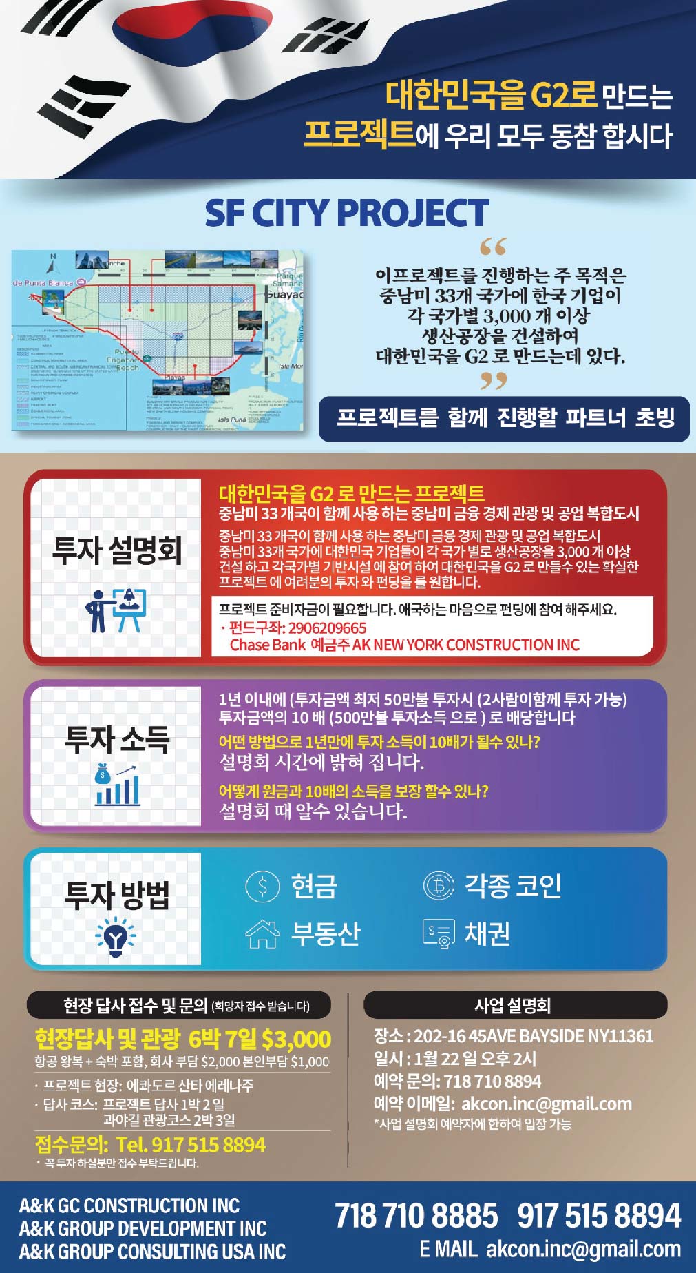 이 절망적인 사태를 극복하고 희망의 개척 시대를 열고자 하여 A & K GROUP DEVELOPMENT INC.는 중남미 에콰도르 이슬라 푸나 (Isla Puna)는 서울의 1.5배, 뉴욕 맨하탄 22배 크기 섬으로 근접 지역 육지에 COVID-19과 같은 국제 정세에 대비하여 1,000개 이상 공장을 건설 할 토지와 800만 인구가 거주할 수 있는 독립된 무인도 섬 토지를 확보하여 미래 지향 적인 SF CITY ( SPACE & FUTURE CITY) 신 도시로 개발 될 수 있도록 20 년간 연구하여 실행 가능한 개발 계획서를 가지고 2021년부터 프로젝트가 진행 할 수 있도록 만반의 준비 작업을 하고 있습니다.